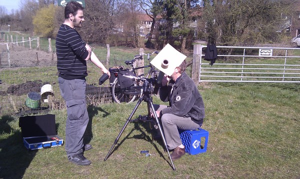 Om de opgevoerde PST zonnekijker eens goed uit te testen heb ik vandaag een mini-solarparty gehouden in de nabij gelegen volkstuintjes. Het was een zonovergoten dag met een perfect temperatuurtje. Waarneemkameraden Steven en Matthijs waren ook van de partij met hun telescopen en veel toevallige (en minder toevallige) voorbijgangers hebben door onze kijkers gekeken. Het was erg gezellig en er was genoeg te zien aan de rand van de zon. De meest prominente protuberansengroep heb ik getekend met rood pastelpotlood op zwart papier. De groep was de hele dag goed te zien, maar veranderde steeds merkbaar van vorm. De tekening toont de groep zoals hij er rond 13.45 uit zag. De fijne details waren prachtig te zien door mijn kijker. Ik ben vergeten in de tekening aan te geven wat het noorden is, maar de groep was door het oculair (9mm, 78x) rechtsonder aan de zonsrand zichtbaar. Dit smaakt naar meer!